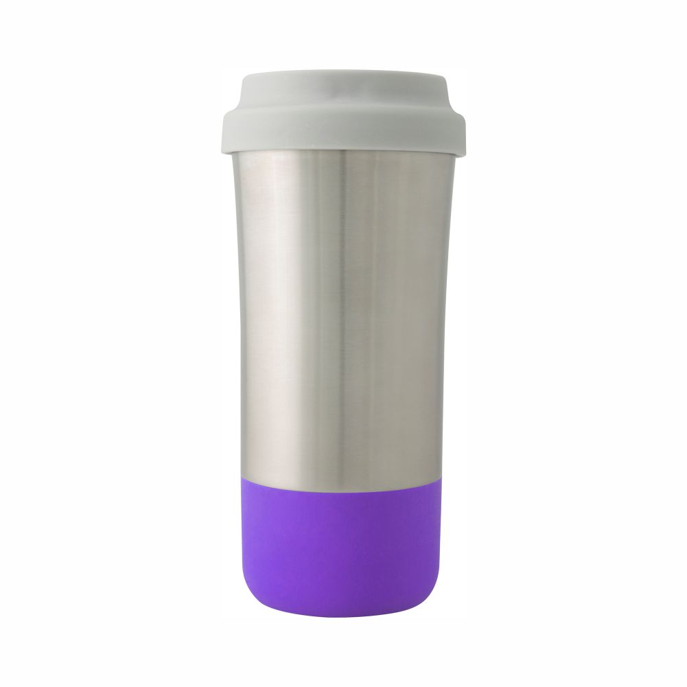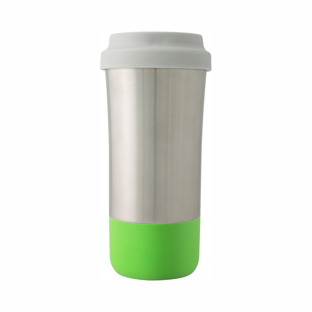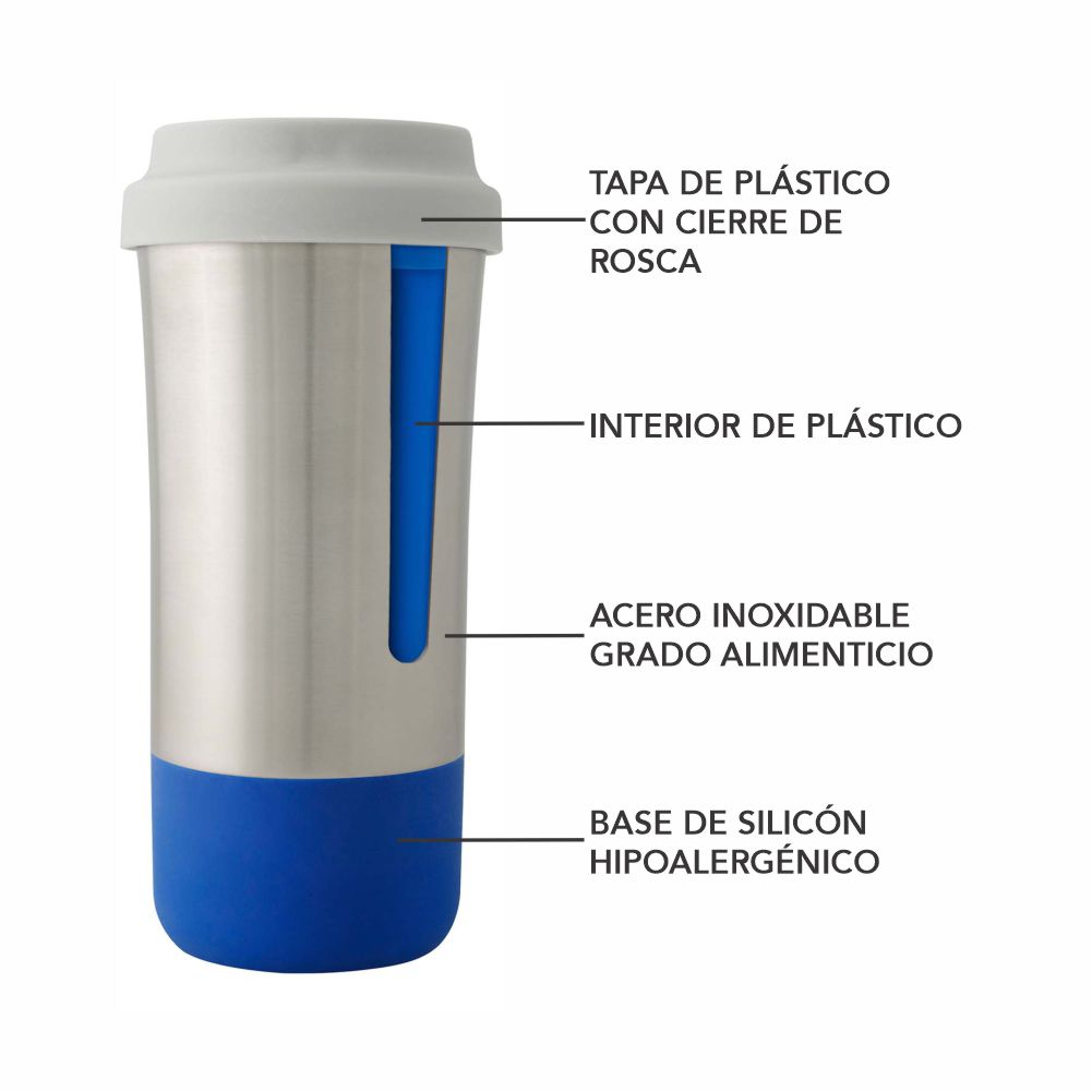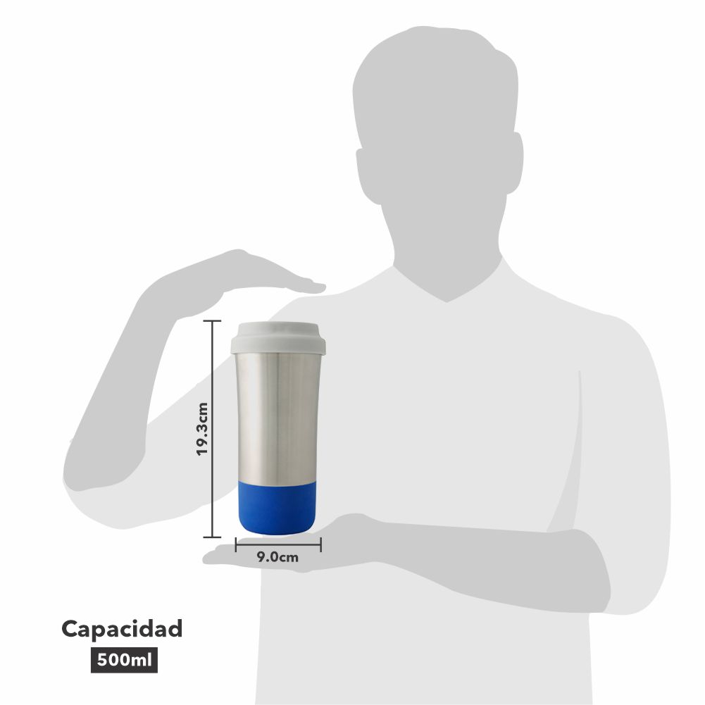 Vaso térmico de acero inoxidable e interior plástico de 500 ml. Base de silicón hipoalergénico (colores varios). Tapa con cierre de Rosca y boquilla de seguridad. Se entrega en caja de cartón individual. Lavar antes de usar.